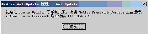 作為一名忠實(shí)的麥粉,多年來我一直使用McAfee這款殺毒軟件。但近一周開始McAfee出現(xiàn)無法更新的狀況,自動(dòng)更新和手動(dòng)更新都失敗,彈出錯(cuò)誤提示窗口的信息為“初始化Common Updater子系統(tǒng)失敗.確保McAfee Framework service正在運(yùn)行.McAfee Framework service返回錯(cuò)誤 ffffffdf @ 3”。
